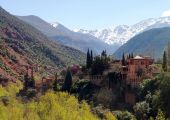Ourika es un precioso valle entre las montañas del Atlas que rodean Marrakech, recorrido por un caudaloso río con preciosos pueblos de adobe en la falda de las montañas nevadas, el paisaje combina el color ocre de la tierra y el verde de las laderas y los frutales, proporcionando un paisaje multicolor.
